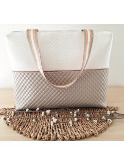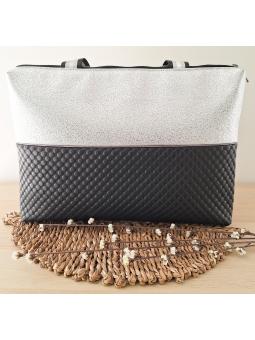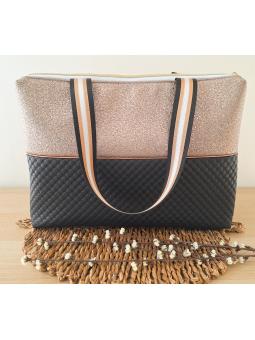 The working bag closes with a large zipper (32cm) and has an inside pocket 24 cm wide / 15 cm deep. Material : faux leather Colour: Padded black and textured gold. Dimensions: 40cm x 32cm x 5cm. Interior lining fabrics are non-contractual (according to available stock).