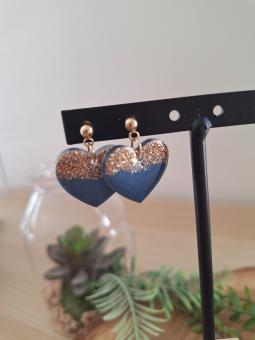 Boucles d’oreilles artisanales "Inès" en résine bleue et bronze pailleté / acier inoxydable. Création faite main, unique, élégante et durable. Diamètre 20mm Livraison gratuite en envoi postal